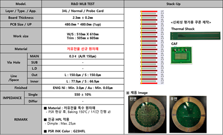 고다층 기판(34층) 시제품 1건 제작하였고, 신뢰성 평가 항목인 Thermal Shock 200 cycle, CAF 1000시간 모두 목표치를 달성